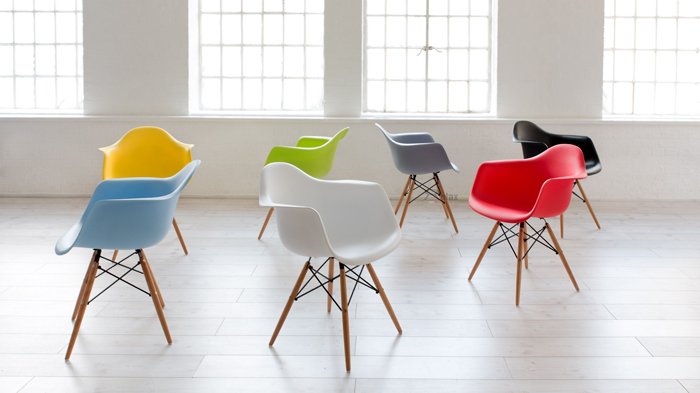 Một thiết kế mang tính bước ngoặt từ Charles và Ray Eames, những chiếc ghế cà phê eames bằng nhựa đúc với những đường cong nâng niu cơ thể người dùng, mang lại một chỗ ngồi thoải mái và linh hoạt.